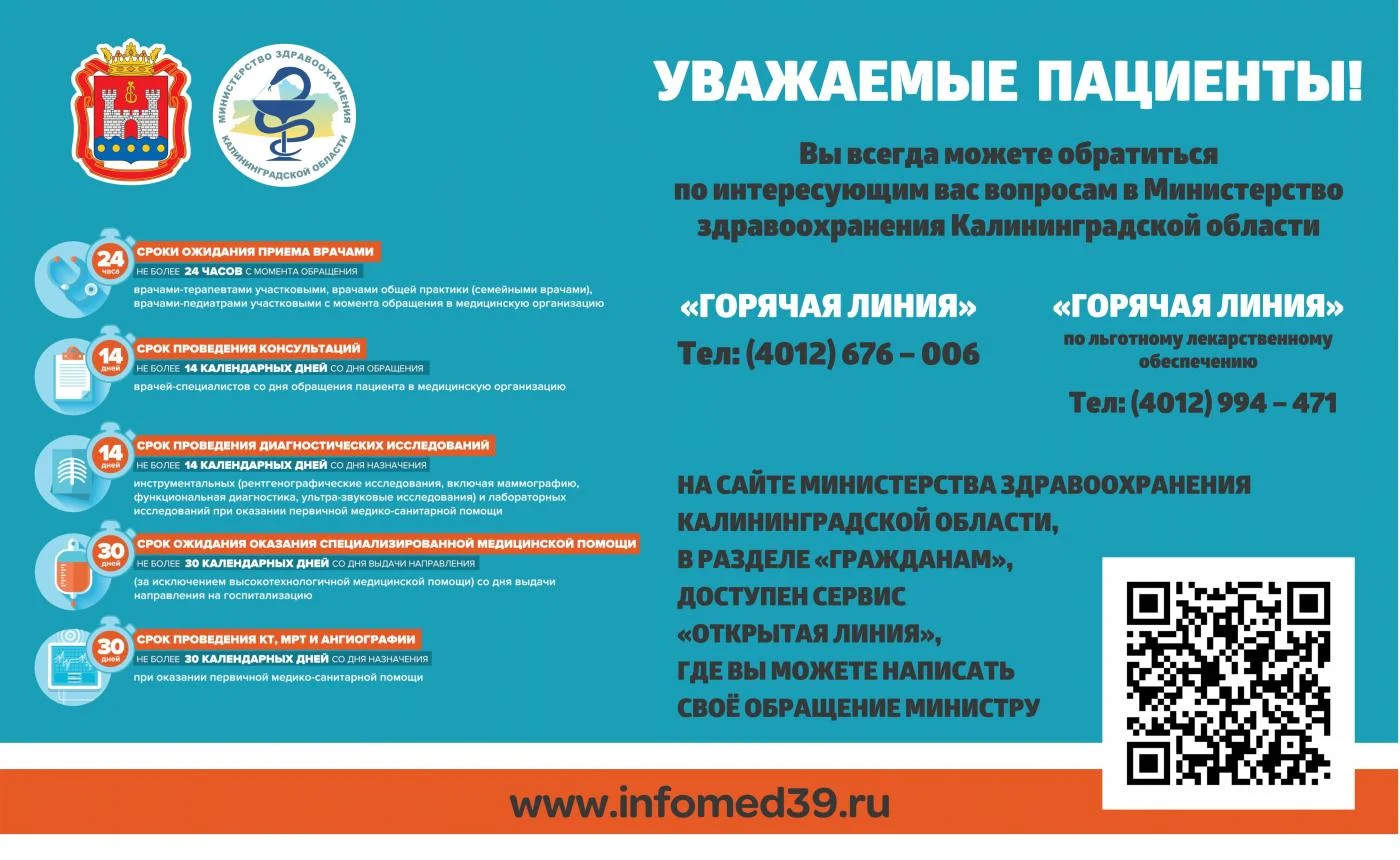 - Телефон горячей линии Департамента здравоохранения Калининградской области: 8 (4012) 53-20-20
