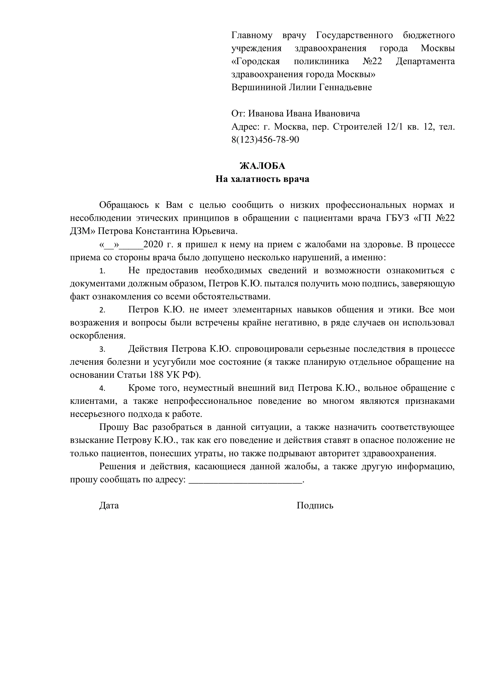- Информация о поликлинике: название, адрес, ФИО врача (если жалоба касается конкретного специалиста).