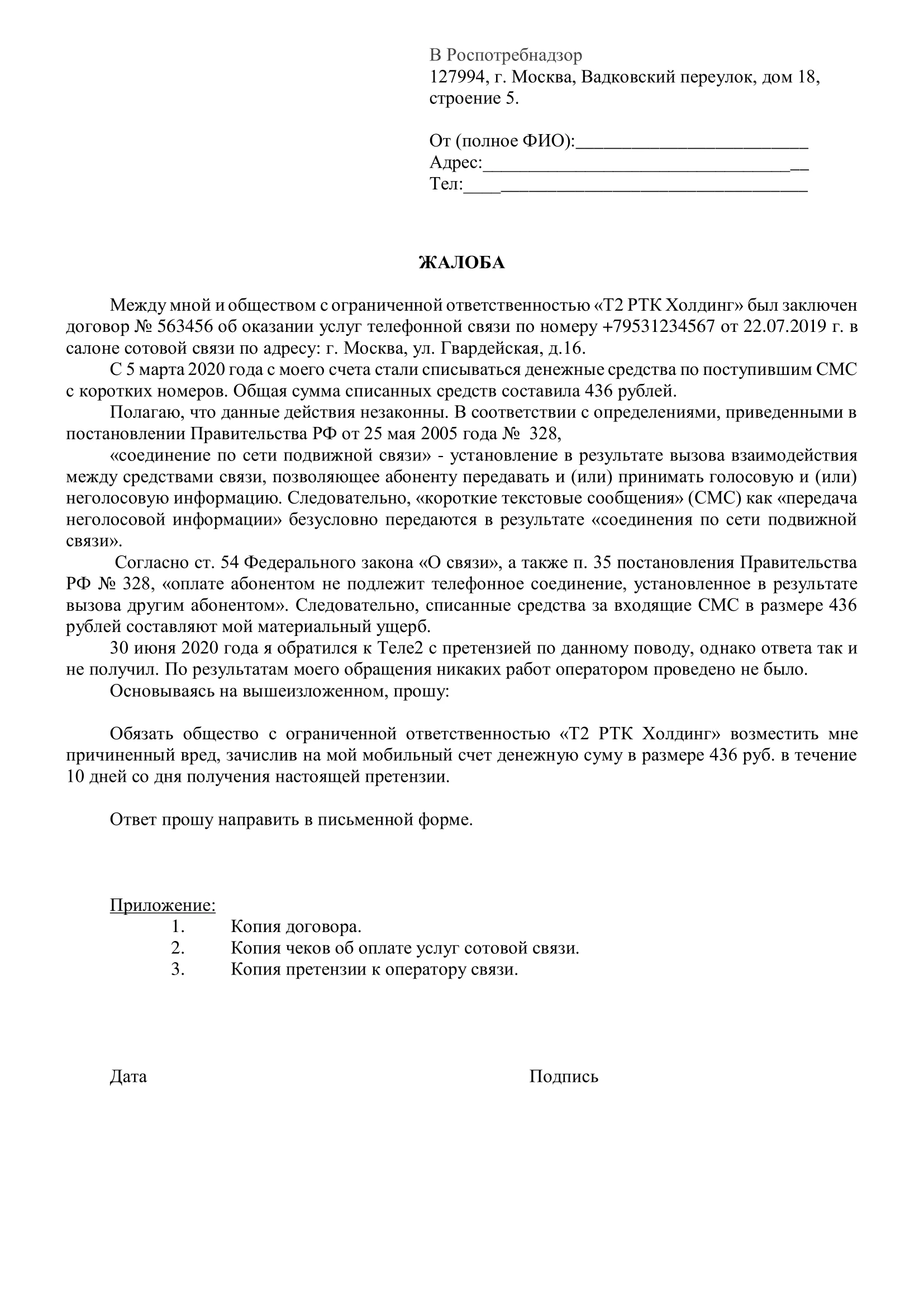 - Адрес: Отправьте жалобу на адрес: 125167, Москва, ул. Гибралтарская, д. 10, Теле2.