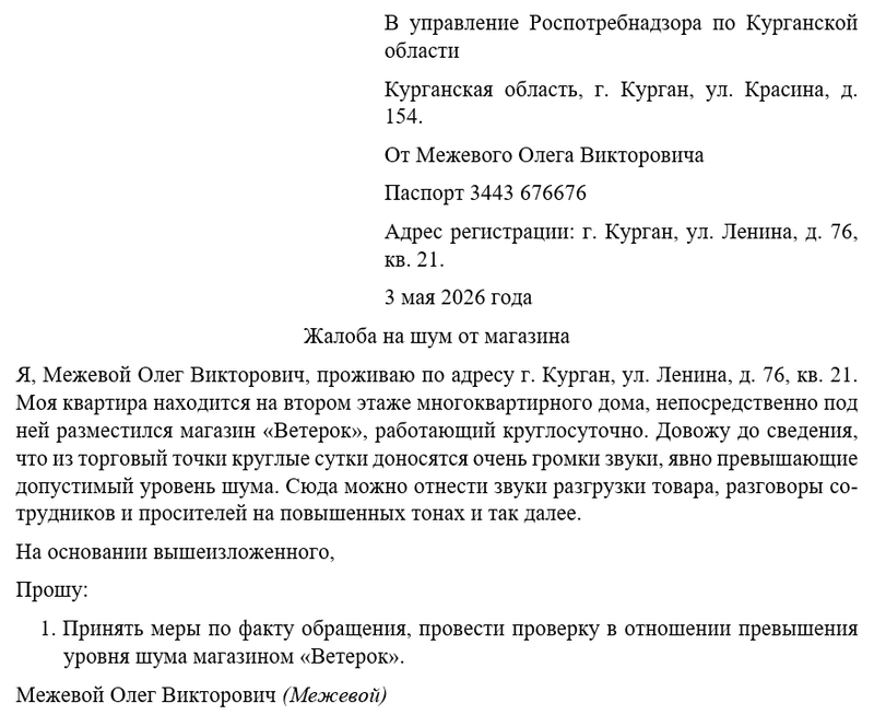 [Ваше имя] [Ваш адрес] [Ваш телефон] [Дата] [Имя управляющего магазина] [Название магазина] [Адрес магазина] Уважаемый(ая) [Имя управляющего], Я, [Ваше имя], проживаю по адресу [Ваш адрес]. Обращаюсь к вам с жалобой на чрезмерный шум, исходящий из вашего магазина, который нарушает мои права на спокойствие и комфорт. [Опишите проблему, указав конкретные даты и время.] Прошу вас принять меры для устранения данной проблемы. С уважением, [Ваше имя]