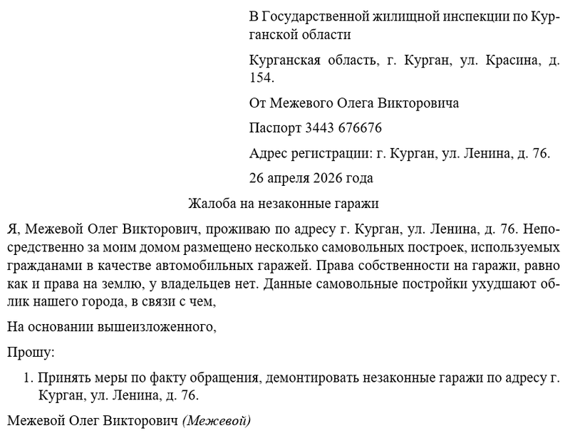 - Требования: что именно вы хотите от органов (например, ликвидация несанкционированного строительства).