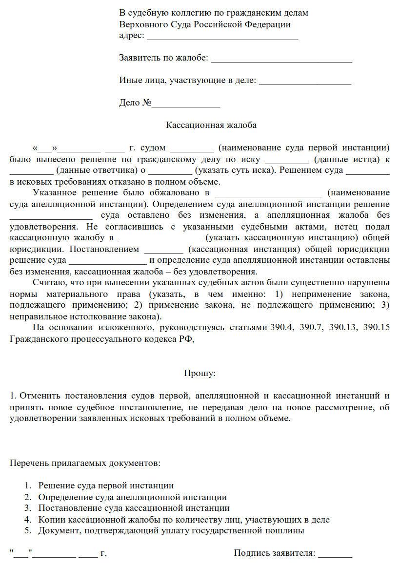 - Копия решения кассационного суда. Это основной документ, на который вы будете ссылаться в своей жалобе.