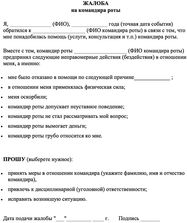 - Непосредственному начальству. Это может быть ваш командир роты или батальона. Они обязаны рассмотреть вашу жалобу и предпринять необходимые меры.