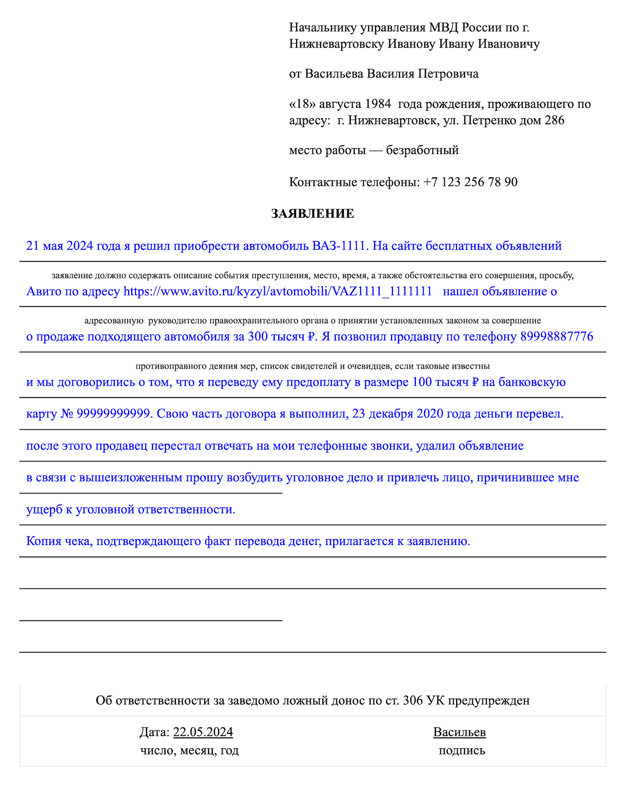 - Укажите свои личные данные. В начале документа обязательно укажите свои фамилию, имя, отчество, адрес и контактные данные. Это поможет органам быстро связаться с вами для уточнения информации.