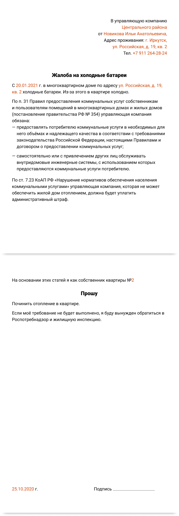 - Доказательства: Укажите на факты, которые подтверждают вашу жалобу (например, показания термометра, фотографии повреждений).