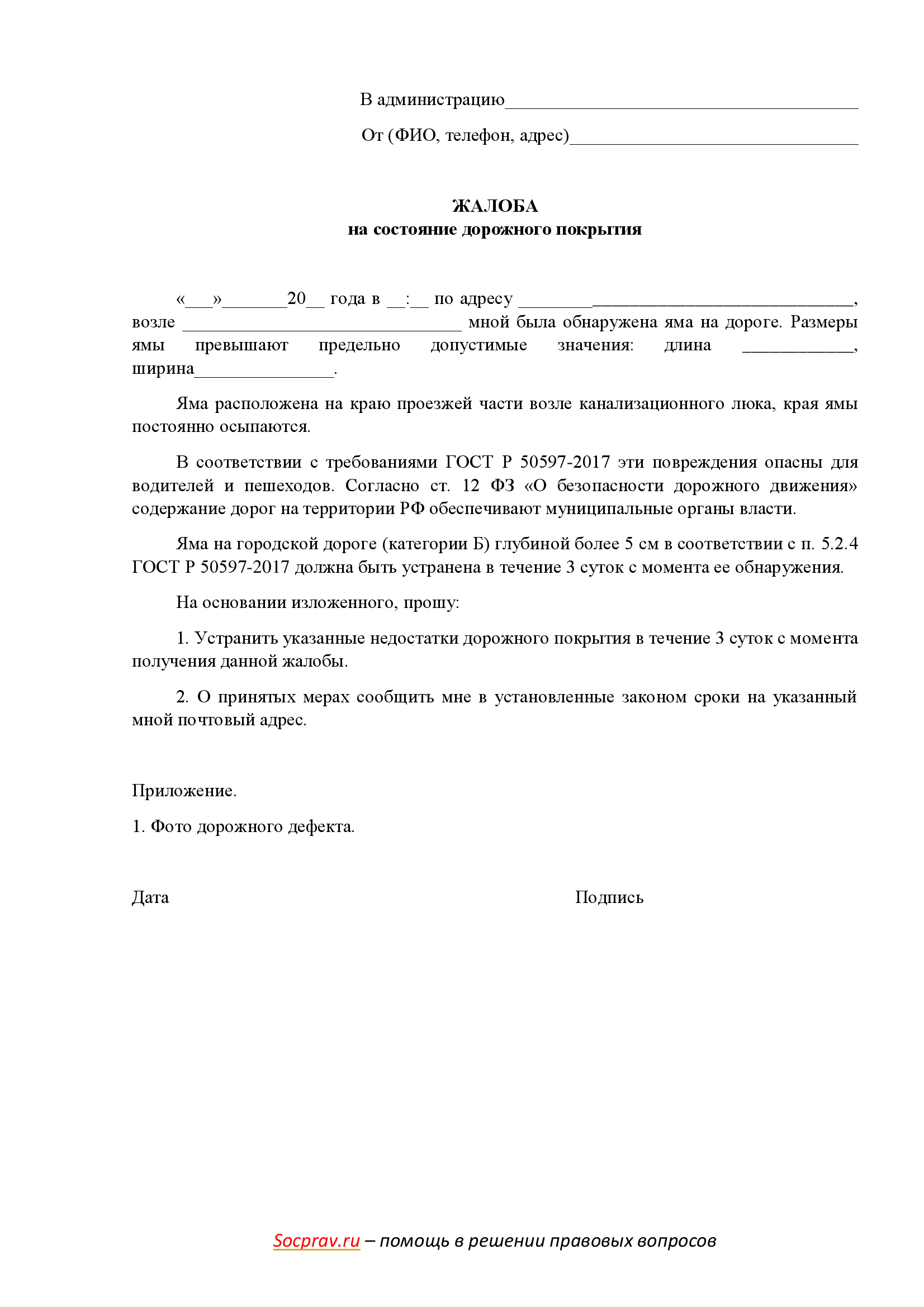 - Фотографии проблемных участков дороги с датой и временем съемки;