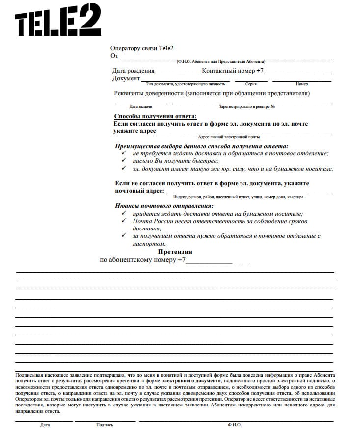 - Отправьте письмо на электронный адрес: info@tele2.ru или через форму обратной связи на сайте.