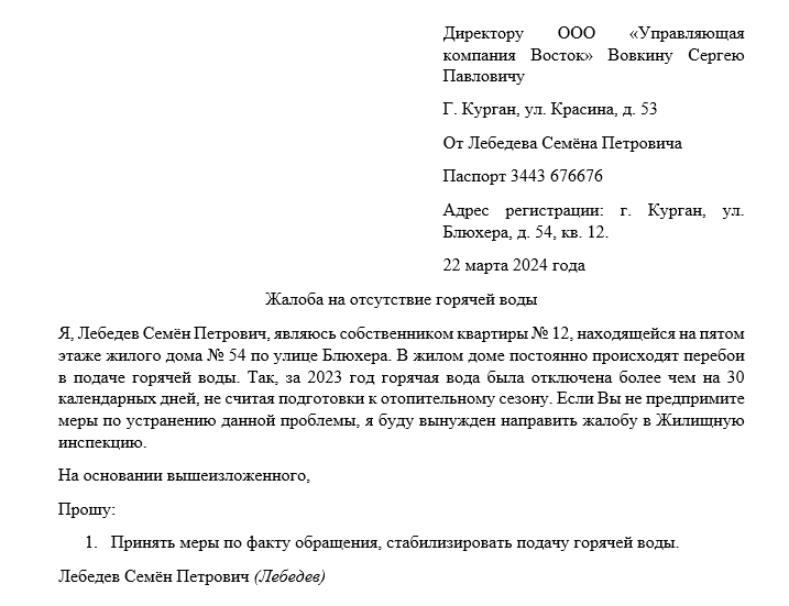 - Ваши требования — что именно вы хотите от инстанции (восстановление горячей воды, компенсация и т.д.).